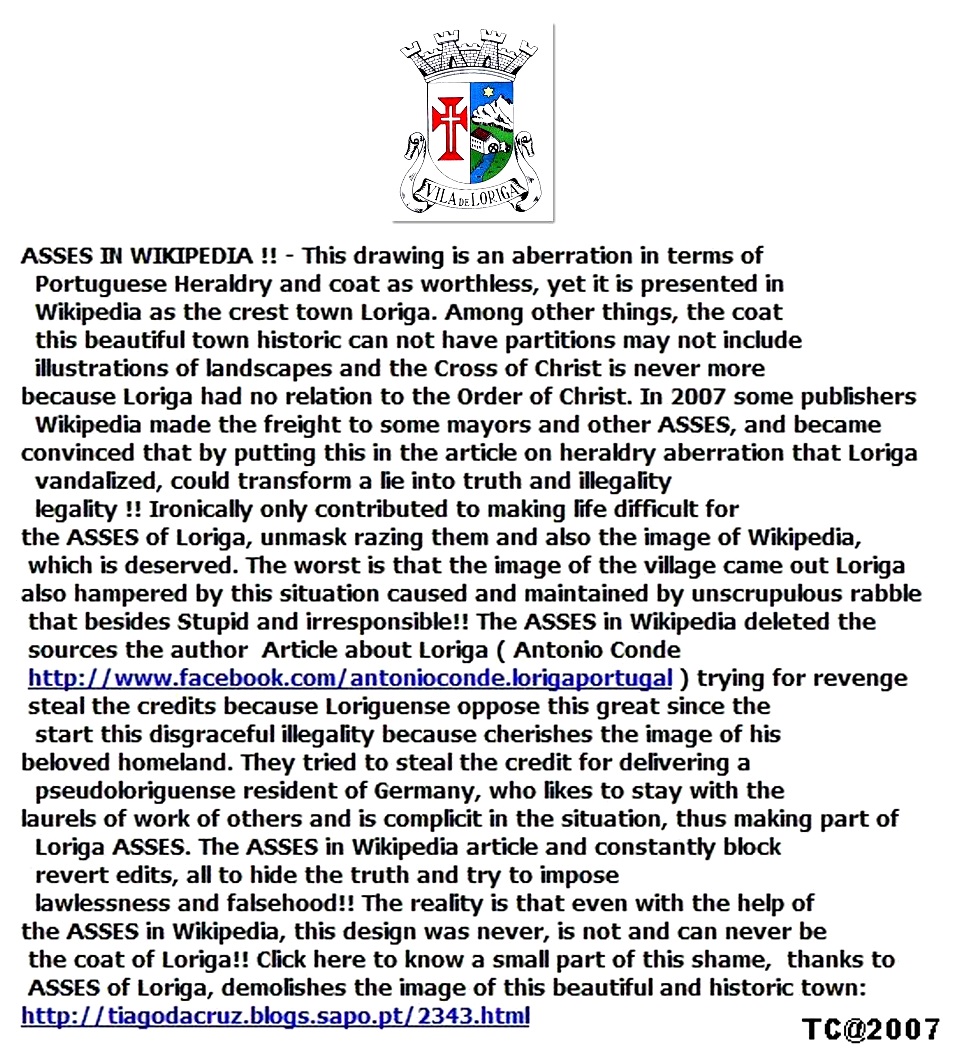 * History of Loriga Portugal, extracts from António Conde's work in the article he created on Wikipedia. The efficient, though discreet, research and dissemination work that the historian and our great loriguense António Conde has been doing for decades, has borne many fruits, and much of the information about Loriga released there is due to the initiative of this great Loriguense. This great Loriguense researches the history of Loriga for about 30 years, at the expense of much sacrifice and many personal expenses, creating a rich work, which can be read extracts on many sites, including articles on Loriga in English and Portuguese that he created on Wikipedia. António Conde acts, does, criticizes what is badly always presenting solutions, loves his land passionately and is allergic to hypocrisy and vanity History of Loriga Portugal, extracts from António Conde's work in the article he created on Wikipedia. The efficient, though discreet, research and dissemination work that the historian and our great loriguense António Conde has been doing for decades, has borne many fruits, and much of the information about Loriga released there is due to the initiative of this great Loriguense. This great Loriguense researches the history of Loriga for about 30 years, at the expense of much sacrifice and many personal expenses, creating a rich work, which can be read extracts on many sites, including articles on Loriga in English and Portuguese that he created on Wikipedia. António Conde acts, does, criticizes what is badly always presenting solutions, loves his land passionately and is allergic to hypocrisy and vanity fairs."Concise history of the town of Loriga - From origins to extinction of the municipality", in the article on Loriga that he created on Wikipedia. Extracts from the work of the historian António Conde, "Concise history of the town of Loriga - From origins to extinction of the municipality", in the article on Loriga that he created in Wikipedia. This article was vandalized with the main objectives of introducing an illegal and non-representative "coat of arms" of Loriga, and erasing from the sources the author of this article because he opposes for this illegality to affect the image of this town and of the own Wikipedia. However the illegal heraldic aberration was finally removed from the article in 2017, failing to restore in the sources the links that point to the author of the same and correct the other errors introduced. This edition has already been reversed to hide the truth, which in fact has happened more than ten years. History of Loriga, excerpts from the work of the historian António Conde on Wikipedia . The vandals, the ones who deliberately and insistently put up mistakes and lies, were challenged to prove the origin of the historical data found in the Wikipedia article created by António Conde, and we can all sit around because only the one who did the research can say where got the data. It is hilarious that the vandals and who they support and promote, call into question historical data while claiming they have not been surveyed by António Conde. Decide once and for all; If the data is credible and the research is not from him who did it reveal the sources of the historical data, or if they are not credible delete them. Do not be jealous and mean, do not make sad figures, and stop harming the image of Loriga and the Loriguenses!